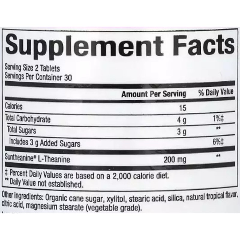 L-теанин является уникальной аминокислотой, встречающейся почти исключительно в чайном растении (Camellia Sinensis) и является основным ингредиентом, придающим необычный вкус зеленому чаю. Теанин отвечает за поддержание сосредоточенности, путем повышения уровней гамма-аминомасляной кислоты и допамина в мозгу. Ученые доказали, что прием L-теанина приводит к излучению мозговых волн, связанных с состоянием релаксации. Препарат содержит Suntheanine - это чистая форма L-теанина, произведенная с помощью запатентованного процесса, имитирующего естественный процесс в листьях зеленого чая.