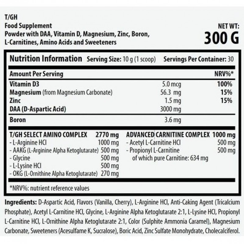 - синергетические аминокислоты (L-Arginine, L-Lysine, OKG) усиливающие эффекты синтеза тестостерона и улучшение репродуктивной функцииTGH от Scitec Nutrition содержит так же витамин D3, бор и другие необходимые минералы, включая цинк, который помогает поддерживать высокий уровень тестостерона в крови.