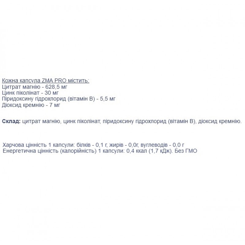 Каждая капсула ZMA PRO содержит: