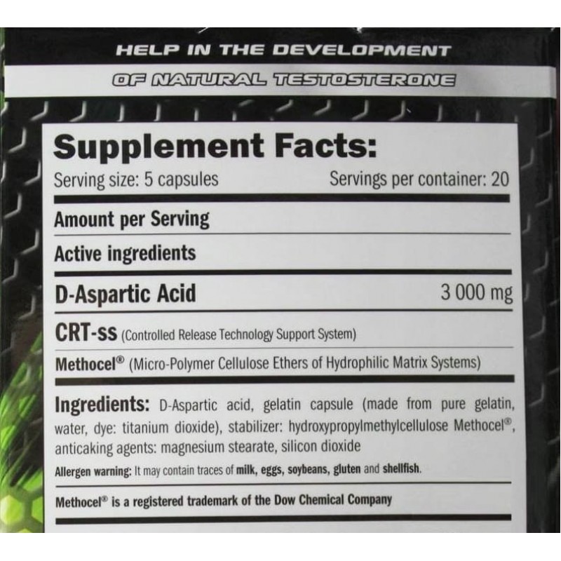 D-AA Max Pure содержит D-аспарагиновую кислоту в форме капсул, что делает ее анаболическим средством и стимулятором. D-аспарагиновая кислота - одна из аминокислот со специфическим действием, механизм ее действия влияет на эндокринную систему, в первую очередь за счет выработки гормона роста и тестостерона. Тестостерон - мужской половой гормон, который важен для поддержания общей жизнеспособности организма, способности наращивать мышечную массу, скорости регенерации или сексуальной активности и фертильности.