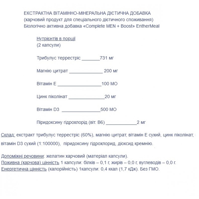 Состав: экстракт трибулус террестрис (60%), магния цитрат, витамин Е сухой, цинк пиколинат, витамин D3 сухой (1:100000), пиридоксина гидрохлорид, диоксид кремния.