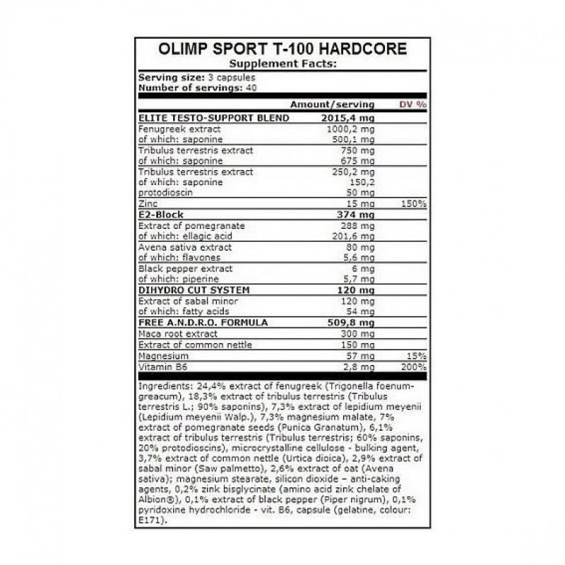 Olimp T-100 может похвастаться формулой TESTO, которая предназначена для предоставления вам большей выработки тестостерона и повышения эффективности использования тестостерона организмом. Он также работает за счет снижения уровня эстрогена и преграждения рецепторов эстрогена. Для улучшения сексуальной функции, Olimp T-100содержит GONADOTROPIC IMPACT ,сочетание состоящее из корня мака и экстрактов пажитника. Эта смесь увеличивает ваши сексуальные желания и улучшения ваши сексуальные возможности! В довершение всего, Olimp T-100 содержит PRO Blend, которая помогает вашему телу лучше справляться при воздействии физического стресса и укрепляет иммунитет от болезни и усталости. Эта смесь также помогает нормализовать гормональный уровень и улучшает поглощение вашего организма необходимых питательных веществ.