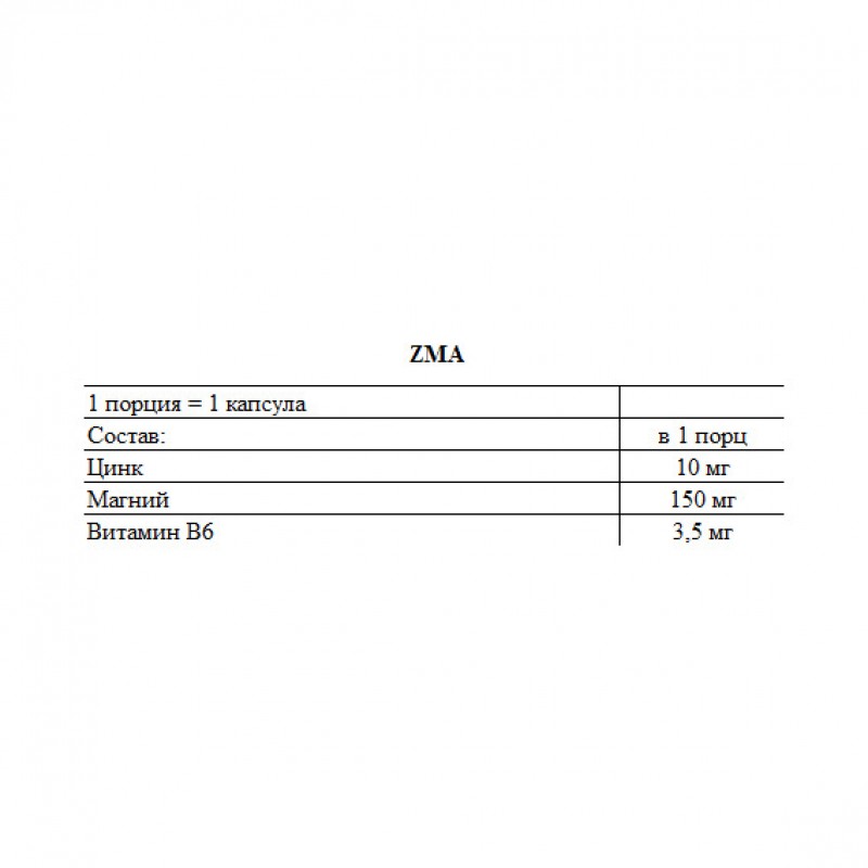 ZMA является продуктом, содержащим цинк и магний в хелатной форме, аминокислоты и витамин B6. Это анаболический комплекс нестероидного происхождения с антиоксидантной формулой. Индивидуальные вещества, содержащиеся в продукте, необходимы для повседневной защиты организма от различных неприятностей, таких как травмы, перенапряжения, связанные с интенсивными физическими нагрузками, отсутствие аппетита, и так называемый окислительный стресс.
