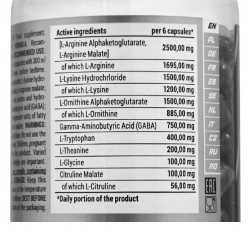 Матрица аминокислот высочайшего качества, поддерживающая ночную секрецию соматропина. Активная формула дополнена ингредиентами, помогающими заснуть, ведь глубокий и непрерывный сон является основным условием беспрепятственной секреции гормона роста. L-триптофан — аминокислота, являющаяся предшественником мелатонина — основного соединения, ответственного за регуляцию ритма сна/бодрствования в организме. Его эффект усиливается L-теанином, полученным из зеленого чая — соединением с расслабляющей активностью, которое увеличивает активность альфа-волн в мозге, поддерживая достижение фазы глубокого сна (REM).