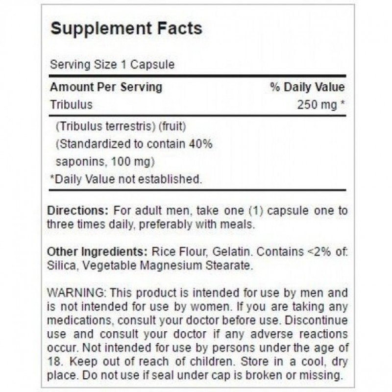 Puritan's Pride Tribulus Terrestris 250 mg - это продукт, который в 1 порции (1 капсула) содержит 250 мг экстракта растения Трибулуса Террестриса, стандартизованного под содержание 40% сапонинов. Как и все продукты американского бренда Puritan's Pride, данный Tribulus Terrestris состоит из ингредиентов фармацевтического качества.