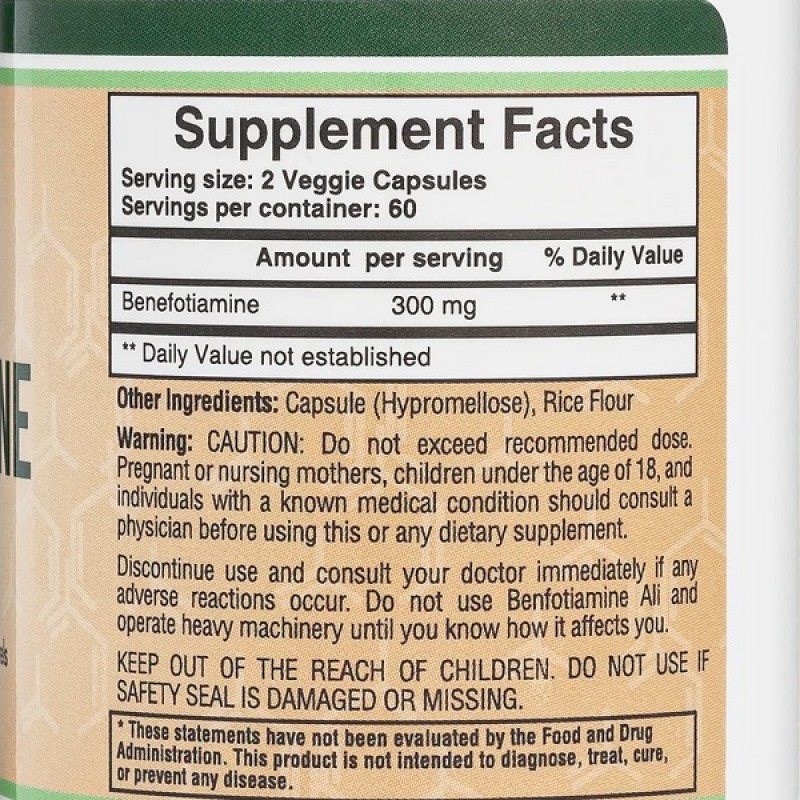 Мы рекомендуем две капсулы по 300 мг бенфотиамина в день, что является достаточной дозой, чтобы обеспечить достаточное количество тиамина для подавляющего большинства людей. Мы не рекомендуем превышать рекомендуемую дозировку, если это не проинструктировано врачом, поскольку побочные эффекты более вероятны при более высоких дозах, и возможно получение слишком большого количества тиамина в день, что вероятно, если этот продукт используется в высоких дозах.