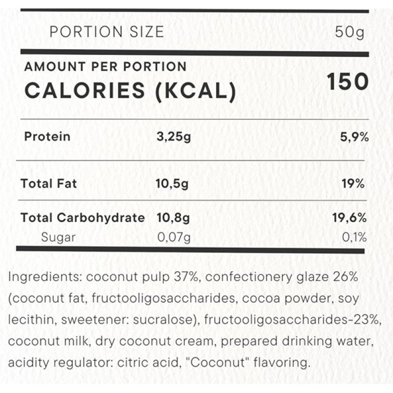 Если Вам трудно отказаться от сладкого, внесите в меню батончик спортивного питания Coconut Bar. Здоровая альтернатива, которая не вредит фигуре, сохраняя ваши идеальные формы — это COCONUT BAR . Батончик абсолютно не содержит сахар и глютен. Вкус кокоса в диетической шоколадной глазури утолит желание съесть сладкое, не нарушая правила рациона. Вкусный и полезный, с высоким содержанием клетчатки, этот батончик не даст сорваться с диеты и подарит море наслаждения.