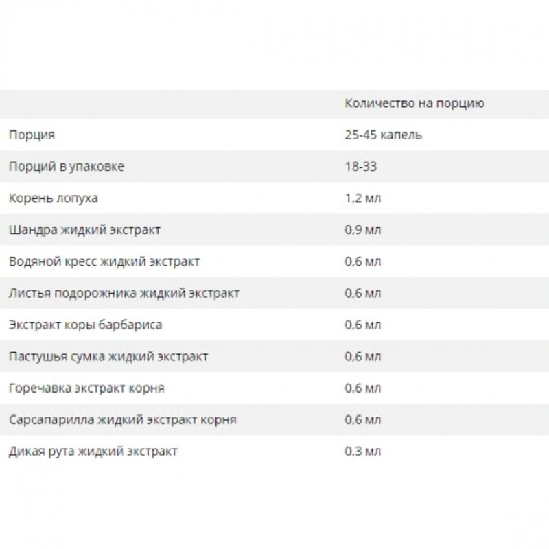 Рута и барбарис также регулируют поток желчи, связывают спазмолитическое действие и расслабление гладких мышц, способствуя правильной подвижности выделительных органов. Водный кресс и пастушья сумка богаты антиоксидантами, оказывает детоксикационное действие и нейтрализует свободные радикалы. Содержат множество витаминов и минералов, оказывающие мочегонное и минерализующее действие.