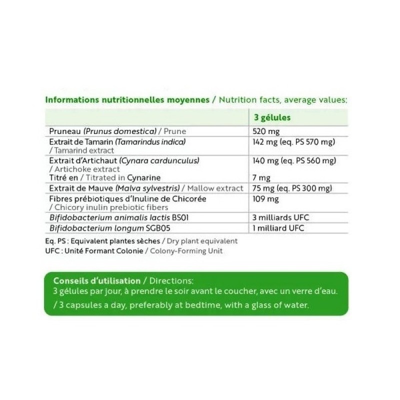 Ингредиенты: пудра чернослива, экстракты растений: мякоти плода тамаринда, листа артишока, плода кассии, листа мальвы, листа сенны; растительная капсула (HPMC, натуральный краситель: медный комплекс хлорофиллинов), экстракт рисовых отрубей, инулин цикория, микрокапсулированный молочнокислый фермент Bifidobacterium animalis lactis BS01, подсолнечное масло.