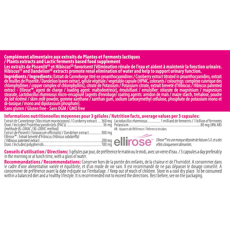 Ингредиенты: Экстракт клюквы титрованный в проантоцианиды, экстракт листьев одуванчика, растительная капсула (HPMC, краситель: медный комплекс хлорофиллинов), цитрат калия, запатентованный экстракт гибискуса - Ellirose™, основа: мальтодекстрин, вещество против слипания: тальк, Lactobacillus rhamnosus микроинкапсулированные (покрывающие вещества: кукурузный крахмал, трегалоза, обезжиренное сухое молоко, ксантановая камедь, натрий карбоксиметил целлюлоза, моно и дикалий фосфат).