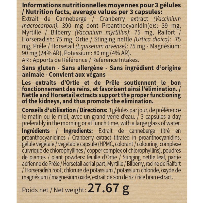 Ингредиенты: Экстракт клюквы титрованный в проантоцианидины, растительная капсула (HPMC, краситель: медный комплекс хлорофиллинов), порошок растений: лист крапивы, надземная часть хвоща, черника, корень хрена; хлорид калия, оксид магния, экстракт рисовых отрубей.