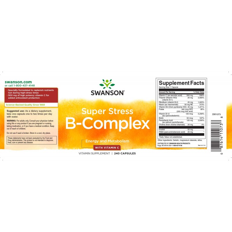 Swanson Super Stress B Complex - это уникальный комплекс, специально разработанный для пополнения запасов питательных веществ, которые наиболее востребованы в периоды сильного стресса. Каждая капсула сочетает в себе обильный запас витаминов группы В с мощной антиоксидантной защитой высокоактивного витамина С.