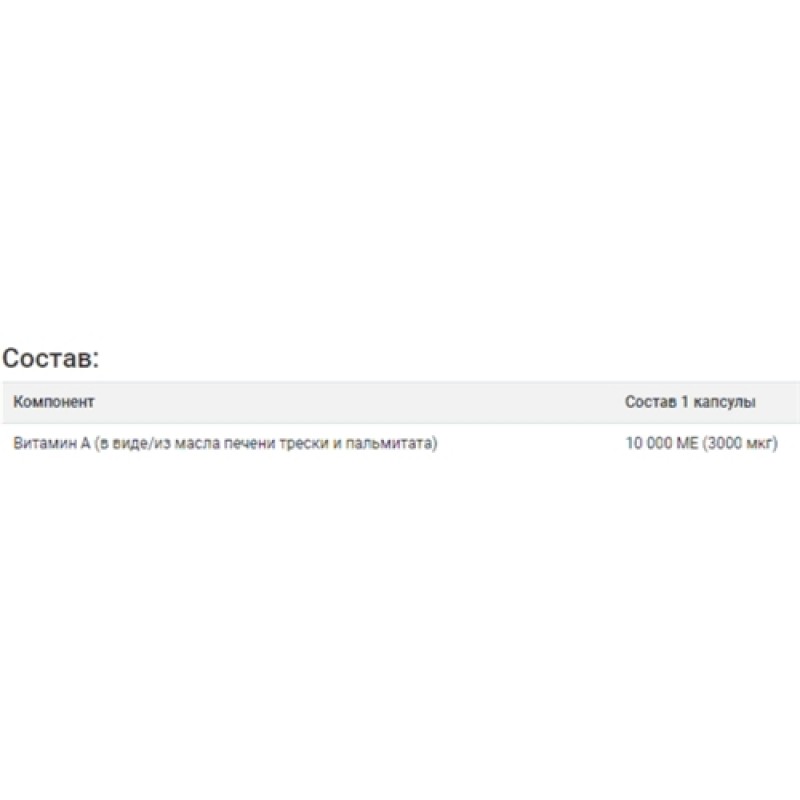 - Витамин А (в виде/из масла печени трески и пальмитата): 10 000 МЕ (3000 мкг)