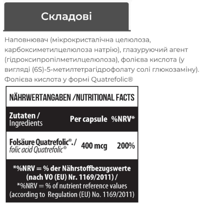 - Использует активную форму фолата Quatrefolic® для максимальной биодоступности.