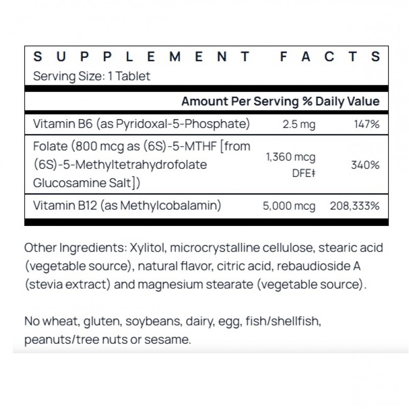 Пастилка Jarrow Formulas метил B-12 с метилфолатом плюс пиридоксаль-5-фосфат (P5P) сочетает в себе активные формы этих витаминов, чтобы поддерживать ДНК, синтез нейротрансмиттеров и метаболизм аминокислот. Метилфолат и B12 преобразуют гомоцистеин в метионин, а P5P-зависимые ферменты — в цистеин.