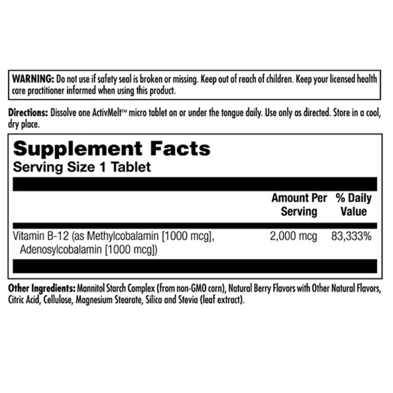 Пищевая добавка ActivMelt обеспечивает двойное действие B-12 из его форм, как метилкобаламин и аденозилкобаламин. Микротаблетки быстро тают во рту и обеспечивают оптимальное усвоение организмом. Очень вкусный натуральный аромат ягод. Метилкобаламин и аденозилкобаламин являются биологически активными формами витамина В-12. Метилкобаламин распространен в крови и других жидкостях организма. Аденозилкобаламин является основной формой, в которой B12 содержится в клеточных тканях и хранится в митохондриях. Вместе они работают синергетически.