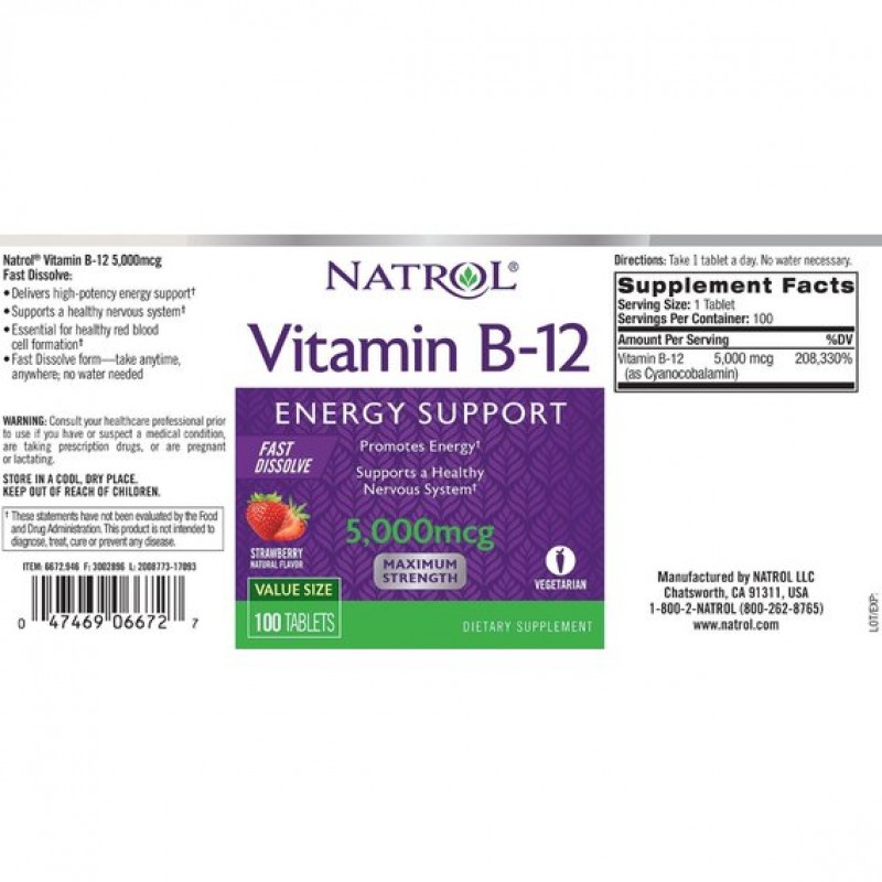 Vitamin B-12 Fast Dissolve от Natrol предлагает солидную дозировку витамина В12, чтобы вы могли поднять свой уровень энергии и получить поддержку для нервной системы.