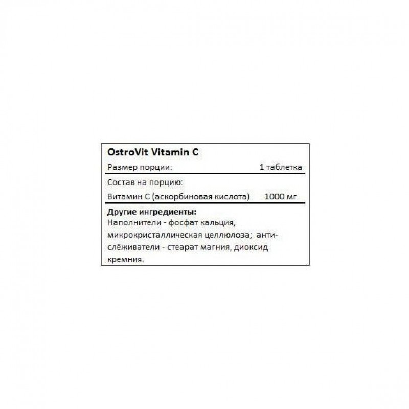 В каждой таблетке Vitamin C от OstroVit содержится 1000 мг витамина С. Данный витамин играет важную роль в нашем организме, в первую очередь за счет своей антиоксидантной и иммуностимулирующей функции. При достаточном уровне данного витамина в теле организм легче сопротивляется вирусным инфекциям и быстрее с ними справляется в случае заражения. Помимо этого, витамин С улучшает общее самочувствие. При его участии происходит синтез коллагена – основного структурного белка всех соединительных тканей.