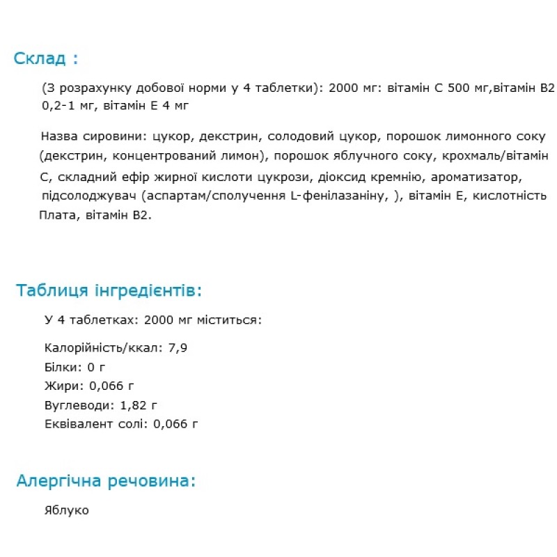 4 таблетки содержат 500 мг витамина С, который равняется 25 лимонам, который поддерживает здоровье кожи и слизистых оболочек. Витамин Е, что также входит в состав, имеет антиоксидантное действие, способствует здоровью клеток и предотвращает накопление оксиданта в организме человека.