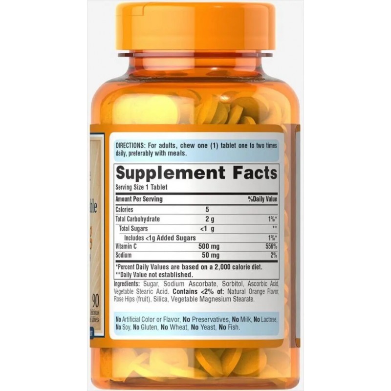 Сахар, аскорбат натрия, сорбит, аскорбиновая кислота, растительная стеариновая кислота. Содержит <2%: натуральный апельсиновый вкус, шиповник (фрукты), диоксид кремния, растительный стеарат магния.