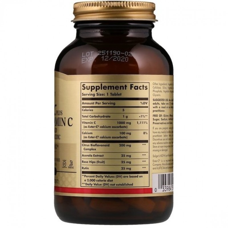 Ester-C Plus создан по эксклюзивной рецептуре Solgar и представляет собой запатентованный, pH-нейтральный (некислотный) и безвредный для ЖКТ сложный эфир витамина C. Метаболиты витамина С в эфире-С положительно влияют на удержание витамина С в клетках, обеспечивая дополнительную пользу. Для формирования уникального комплекса метаболита аскорбата кальция используется особый производственный процесс. Этот хорошо сохраняющийся комплекс также включает природные биофлавоноиды и ягод ацеролы наряду с плодами шиповника.