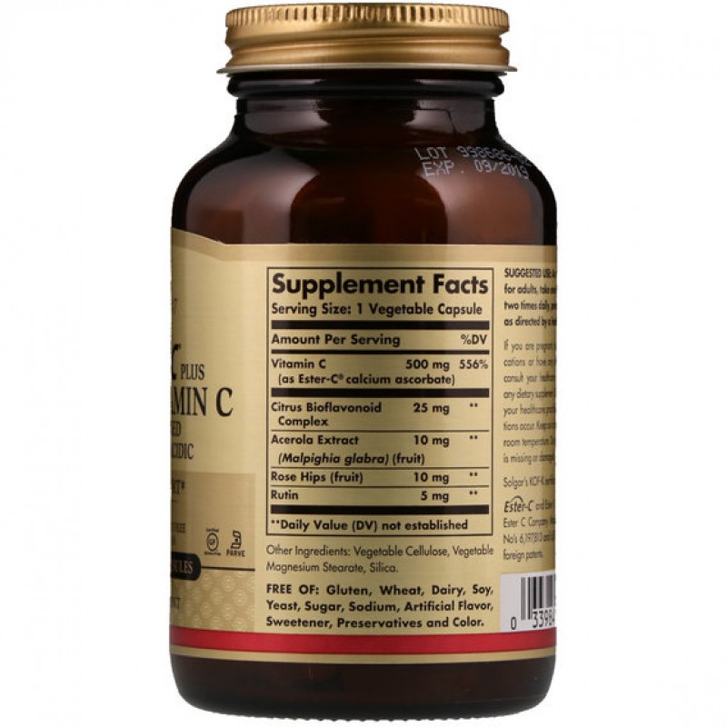 Ester-C Plus создан по эксклюзивной рецептуре Solgar и представляет собой запатентованный, pH-нейтральный (некислотный) и безвредный для ЖКТ сложный эфир витамина C. Метаболиты витамина С в эфире-С положительно влияют на удержание витамина С в клетках, обеспечивая дополнительную пользу. Для формирования уникального комплекса метаболита аскорбата кальция используется особый производственный процесс. Этот хорошо сохраняющийся комплекс также включает природные биофлавоноиды и ягод ацеролы наряду с плодами шиповника.