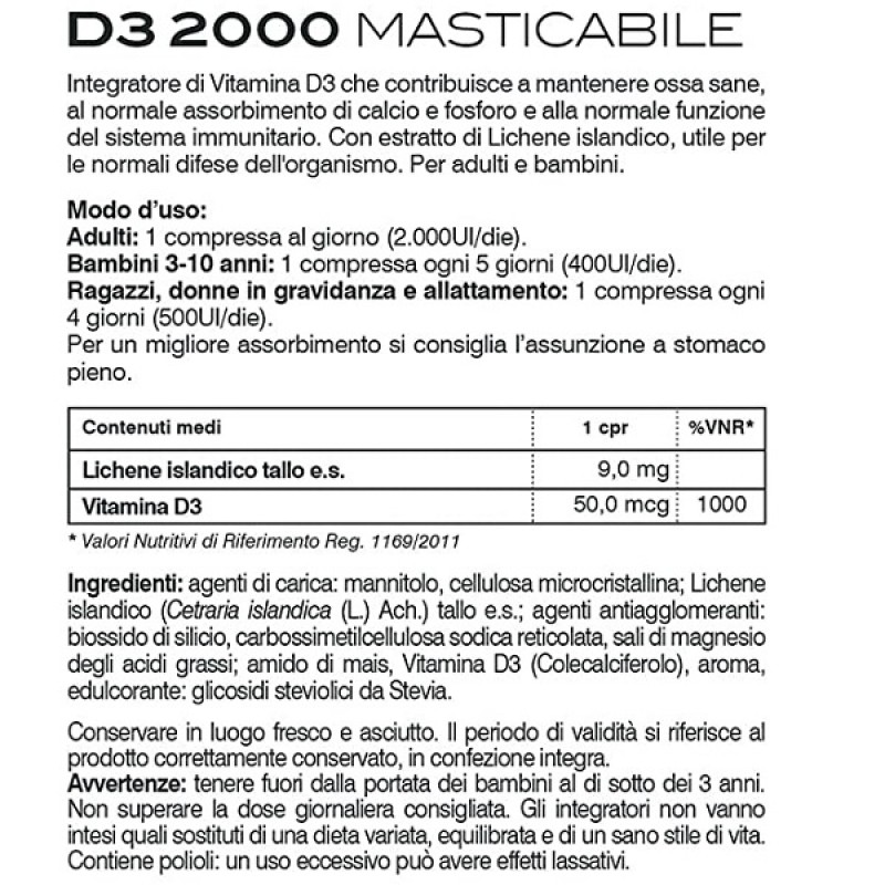 Добавку D3 2000 Vegetale следует принимать в случае дефицита или повышенной потребности в витамине D. Особенно подходит для детей и молодых людей в фазе роста.