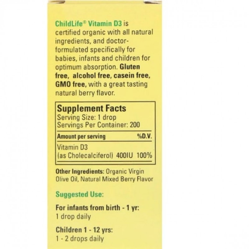 ChildLife Vitamin D3 сертифицирован органически со всеми натуральными ингредиентами и разработан специально для младенцев, младенцев и детей для оптимального усвоения.