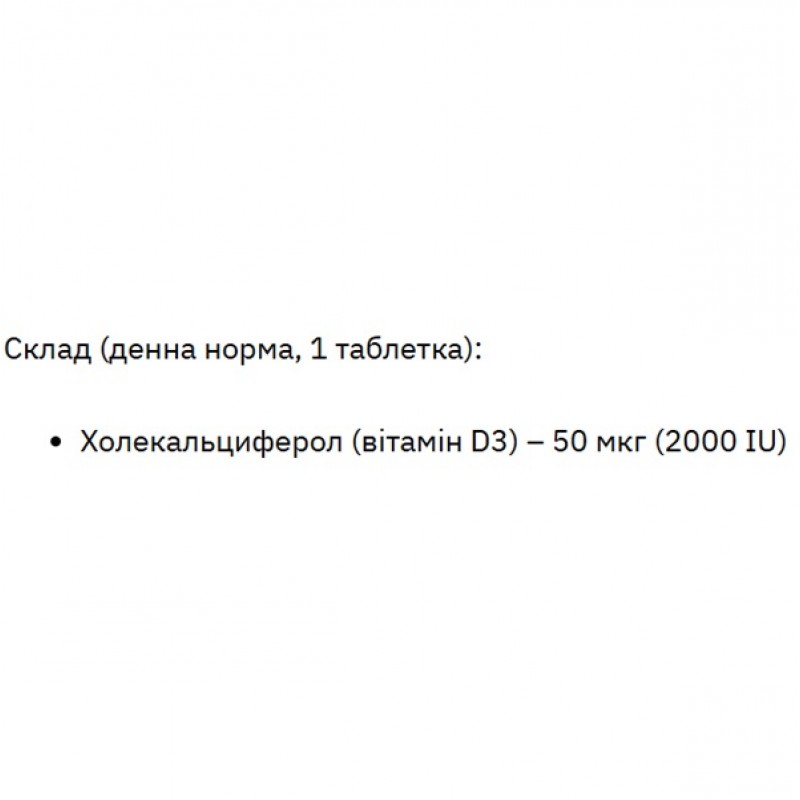 - холикальциферол (витамин D3) – 50 мкг (2000 IU).