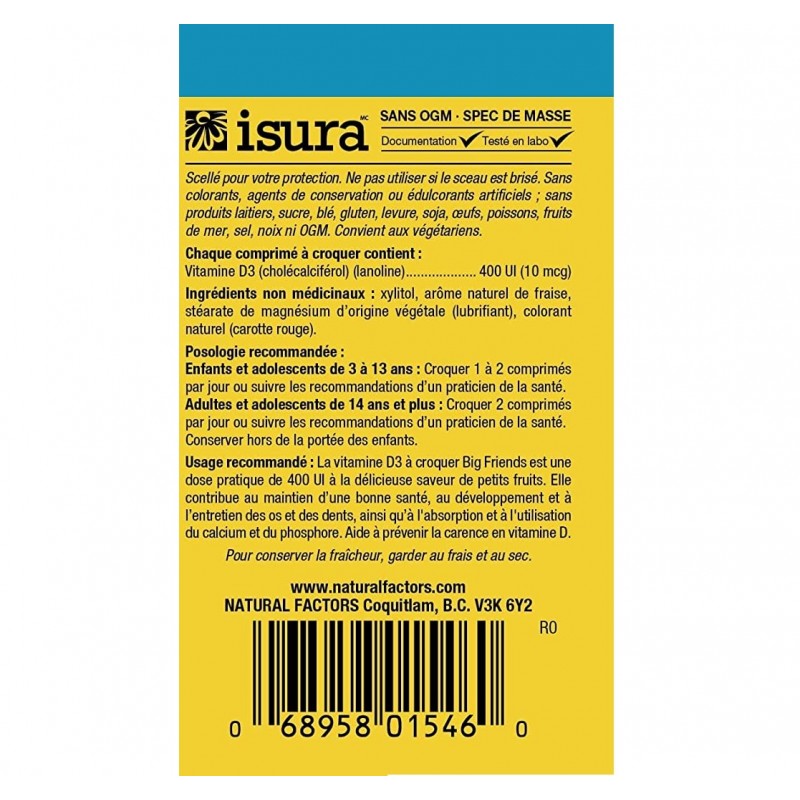 p>Витамин Д3 с ягодным вкусом, 400 МЕ, Big Friends, Chewable Vitamin D3, Berry Bunch, 400 IU от Natural Factors изготовлен специально для детей. Дефицитом витамина Д3 страдают дети рожденные в зимне-осенний период, когда мало солнечных лучей. Синтезируется витамин Д3 только под воздействием солнечного света. Дефицит витамина угрожает многими проблемами для быстро растущего организма малыша: развитие рахита, нарушения со стороны костной системы и роста зубов и другими серьезными заболеваниями. Прием витамина Д3 предупредит развитие многих заболеваний. Продукт от Natural Factors не содержит алкоголя, включает только натуральные ингредиенты, максимально усваивается организмом и имеет приятный натуральный вкус.