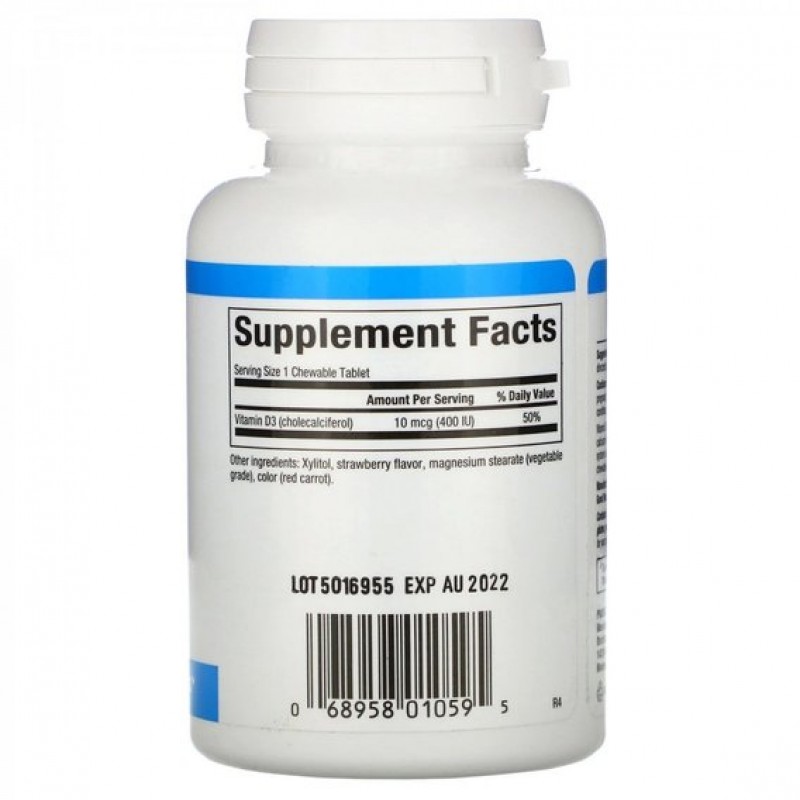 Витамин D3 необходим для поддержания прочности костей и зубов, так как он помогает организму усваивать кальций из пищи. Его роль в регулировке уровня кальция в организме позволяет ему также регулировать состояние иммунной системы, поддерживая здоровье нервов и мышц. Вкусные жевательные таблетки с ароматизатором со вкусом клубники, подслащенные ксилитом, низкокалорийным подсластителем с низким гликемическим индексом.