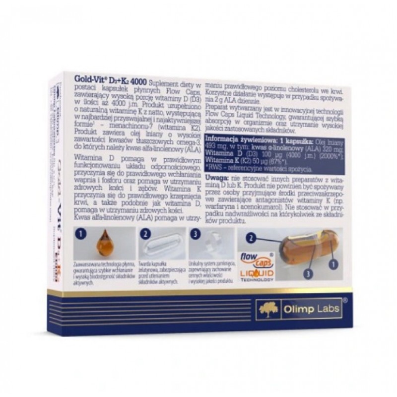 Gold-Vit D3+K2 - это биологически активная добавка в форме жидких капсул, содержащая большое количество витамина D (D3) в дозе до 4000 МЕ. Продукт был дополнен натуральным витамином К с натто, найденным в наиболее абсорбируемой и наиболее активной форме - менахиноне-7 (витамин К2). Витамин D помогает в правильном функционировании иммунной системы, способствует правильному усвоению кальция и фосфора, помогает в поддержании здоровья костей и зубов. Витамин К способствует нормальному свертыванию крови и, как и витамин D, помогает поддерживать здоровье костей.