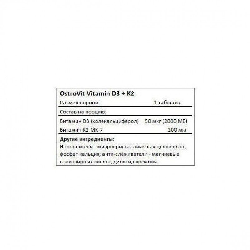 витамины К2 и D3, наполнители (фосфат кальция, микрокристаллическая целлюлоза); вещества, предотвращающие слипание (магниевые соли жирных кислот, кремния диоксид).