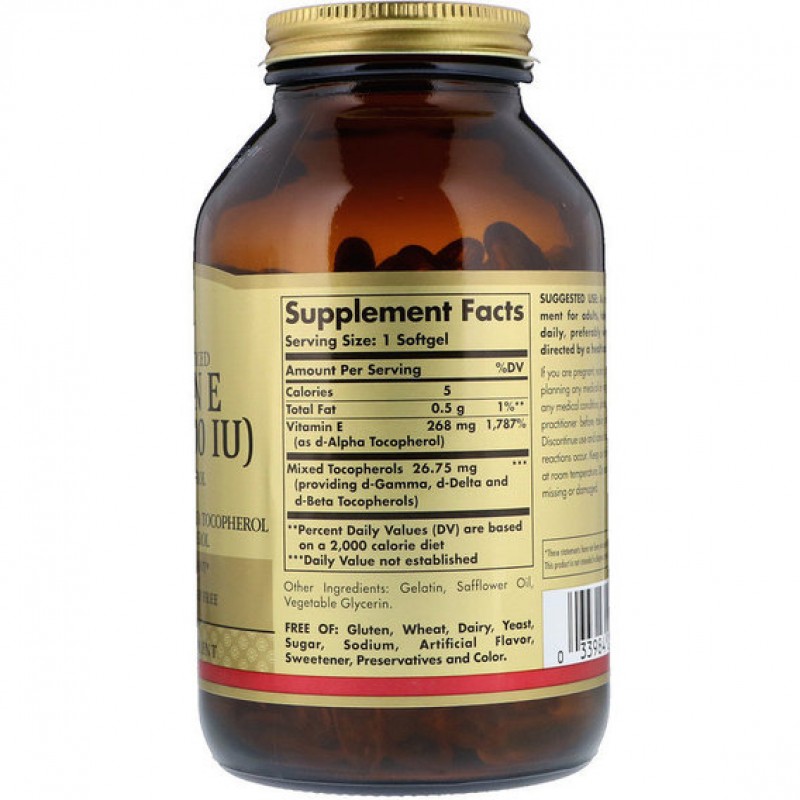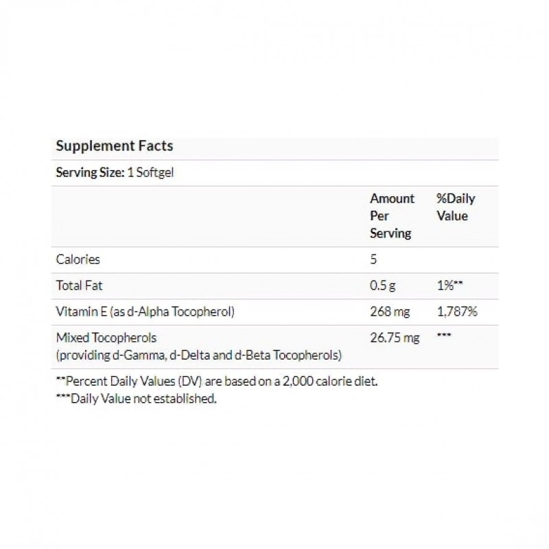 Витамин E играет важнейшую роль в работе организма и является жирорастворимым антиоксидантом. Витамин E предоставляет питательную поддержку иммунной системе. Он помогает бороться с повреждающими клетки свободными радикалами, которые вызывают окислительный стресс в организме, что может способствовать преждевременному старению клеток. Препарат является натуральным источником витамина E в форме D-альфа токоферола вместе со смешанными токоферолами, включая D-гамма, D-дельта, и D-бета токоферолы Желатиновые капсулы на основе масла для содействия оптимальному всасыванию и усваиванию.