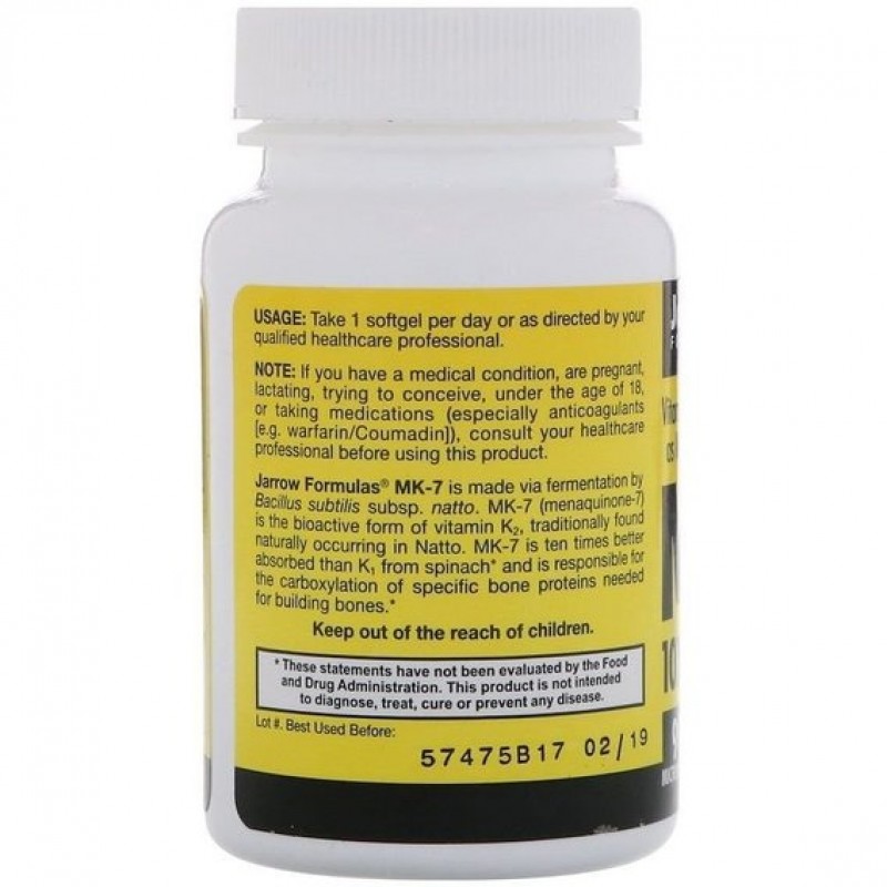 Препарат «MK-7» от Jarrow Formulas производится путем ферментации Сенной палочки (подвида натто). MK-7 (менахинон-7) — это биоактивная форма витамина К2, которая природно содержится в соевом продукте натто. MK-7 в 10 раз лучше усваивается, по сравнению с K1 из шпината и отвечает за карбоксилирование определенных костных протеинов, необходимых для формирования костей.