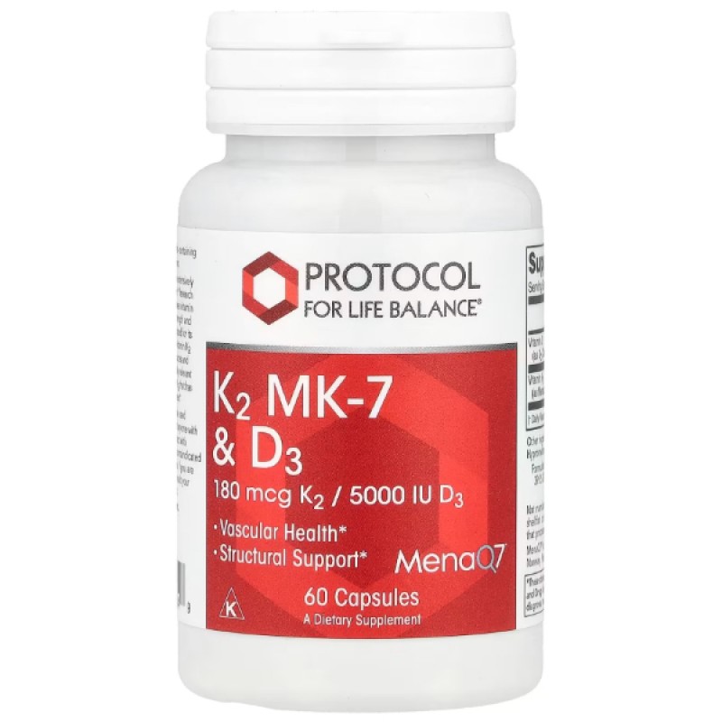 Витамин Д3 и К2 (K2 MK-7&D3), Protocol for Life Balance работают вместе, каждый из них усиливает действие другого. В одной упряжке эти вещества эффективно поддерживают здоровье сердца, сосудов (артерий и вен), респираторной и иммунной систем. Также среди прочего они укрепляют кости.