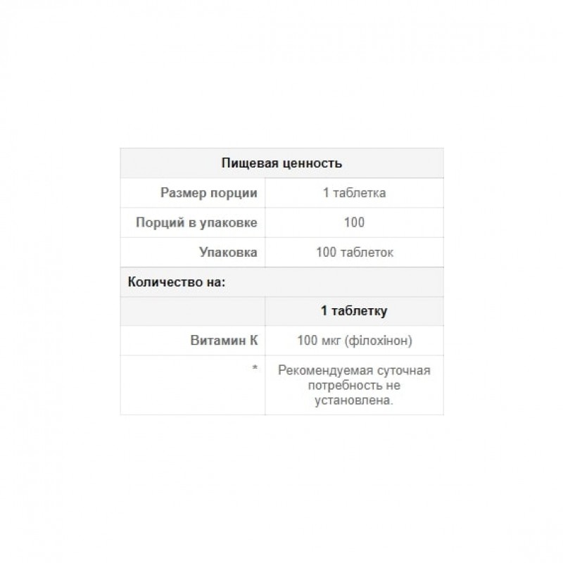 Puritan's Pride Vitamin K 100 mcg - не содержит искусственных ароматизаторов, красителей и подсластителей, консервантов, сахара, молока, лактозы, сои, глютена, пшеницы, дрожжей, рыбы, натрия.