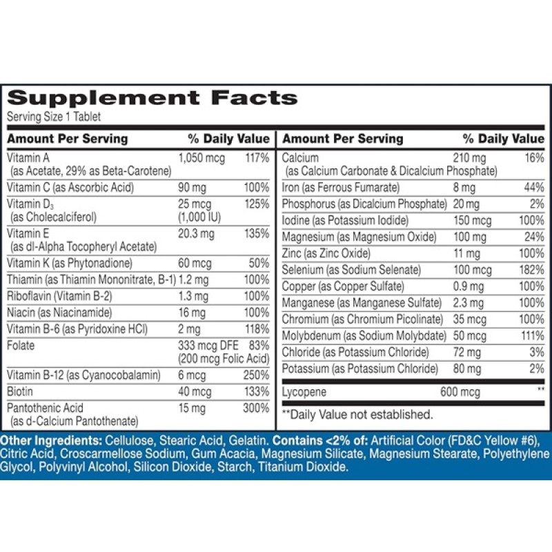 Крахмал, целлюлоза, стеариновая кислота. Содержит <2%: искусственного красителя (fd & c yellow # 6), аскорбил пальмитата, bha, bht, лимонной кислоты, кукурузного масла, кроскармеллозы натрия, dl-альфа-токоферола, этилцеллюлозы, желатина, гуммиарабика, стеарата магния, мальтодекстрина, маннита , колышек, поливиниловый спирт, диоксид кремния, алюмосиликат натрия, аскорбат натрия, сахароза, тальк, диоксид титана, растительное масло, вода