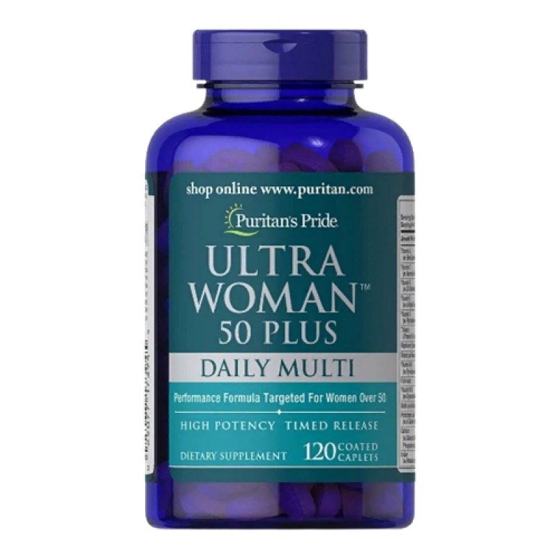 Мультивитамины для женщин ультра 50+, Ultra Woman 50 Plus Multi-Vitamin, Puritan's Pride разработанны с целью обеспечения организма женщины достаточным количеством питательных веществ, когда потребности организма возрастают в них. Формула способствует повышению защитных сил организма (улучшается сопротивляемость организма, замедляются воспалительные процессы) и жизненного тонуса (уменьшается усталость, снижается утомляемость). Специально подобранный комплекс витаминов и минералов способствует улучшению состояния кожи, волос и ногтей.