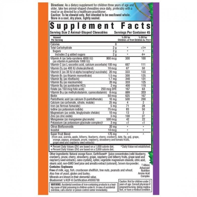 Bluebonnet's Super Earth Rainforest Animalz Whole Food Based Multiple помогает преодолеть пробел в питательных веществах, обеспечивая важные витамины, минералы, суперфрукты и овощи во вкусных жевательных конфетах в форме животных.