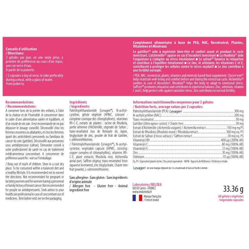 ENDOMELIA® - это препарат на основе PAC, NAC, ресвератрола, растительных экстрактов (витекса, манжетки, родиолы и шафрана), витаминов (В9, С и Е) и минералов (цинк и селен).