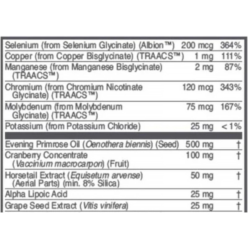 Витамины Е и С, клюква, экстракт виноградных косточек, цинк и коэнзим Q10 – сильные антиоксиданты для борьбы со свободными радикалами и выведения их из организма, а также для борьбы с признаками старения кожи. Важным компонентом является железо, так как женщины подвергаются его дефициту чаще, чем мужчины. Ферменты обеспечат поддержку нормального пищеварительного процесса и улучшение всасывания питательных веществ.
