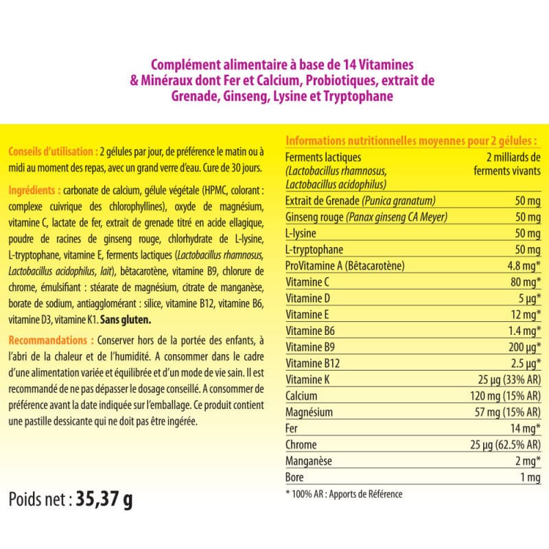 Ингредиенты: карбонат кальция, растительная капсула (HPMC, краситель: медный комплекс хлорофиллинов), оксид магния, витамин С, лактат железа, экстракт граната, титрованный в эллаговую кислоту, сухой экстракт корня красного женьшеня, L-лизина гидрохлорид, L-триптофан, витамин Е, пробиотические лактоферменты (Lactobacillus rhamnosus, Lactobacillus acidophilus, молоко), бета-каротин, витамин B9, хлорид хрома, эмульгатор: стеарат магния, цитрат марганца, борат натрия, вещество против слипания: кремнезем, витамин B12, витамин В6, витамин D3, витамин К1.
