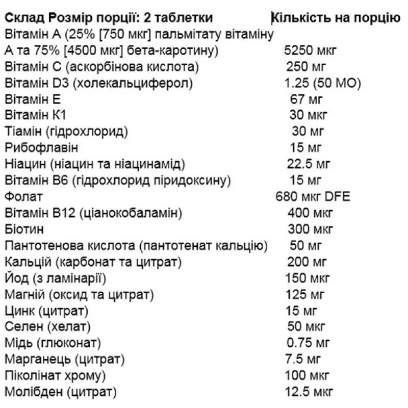 Комплекс включает в себя широкий спектр важных витаминов, таких как витамин A, витамин С, витамины группы B, витамин D3, витамин Е и другие. Эти витамины необходимы для поддержания иммунной системы, нормального функционирования нервной системы, здоровья кожи и зрения, а также для поддержания здоровых костей и суставов.