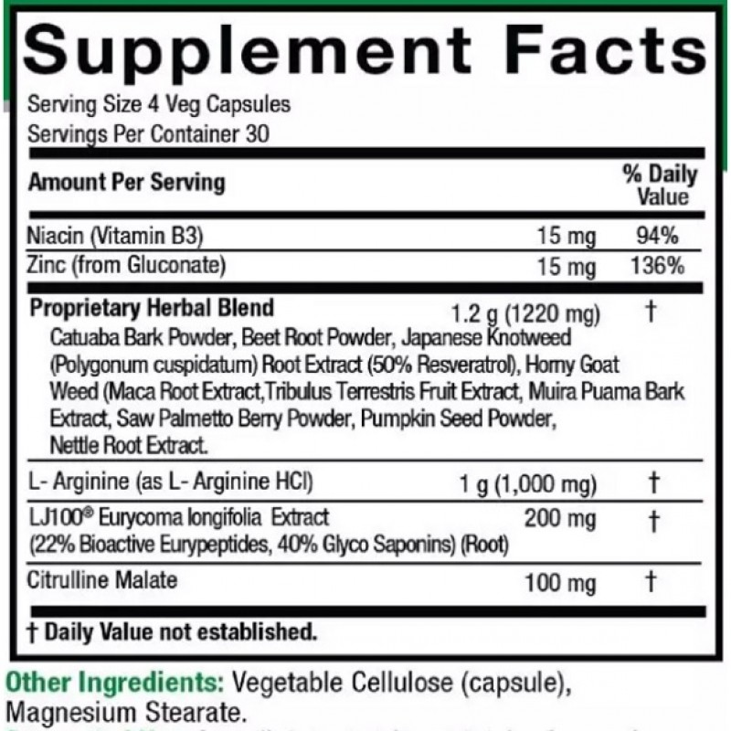 Male Complete от Nature's Answer - это веганская комбинация трав, которая содержит 200 мг LJ100 на четыре капсулы, предназначенные для поддержания мужского здоровья. Эта передовая формула содержит научно обоснованный экстракт LJ100 Тонгкат Али (Eurycoma Longifolia), а также ключевые ингредиенты, такие как цинк, ниацин, L-аргинин и цитруллин малат, которые помогают поддерживать здоровый уровень тестостерона и повышать либидо.