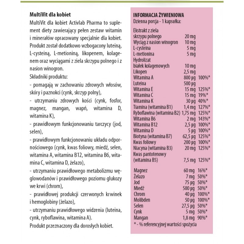 MultiVit для женщин Activlab Pharma — это биологически активная добавка, содержащая полный набор витаминов и минералов, разработанная специально для женщин. Продукт дополнительно обогащен лютеином, L-цистеином, L-метионином, ликопином, коллагеном и экстрактами травы хвоща полевого и виноградных косточек.