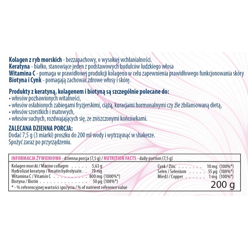 гидролизованный коллаген морской рыбы, L-аскорбиновая кислота, регулятор кислотности - лимонная кислота, краситель - свекольный красный, ароматизаторы, гидролизат кератина, бисглицинат цинка, L-селенометионин, диглицинат меди, D-биотин, подсластители: гликозиды сукралозы и стевиола, эмульгатор - лецитин (из сои)