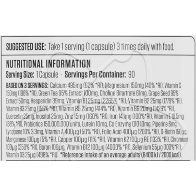Applied Nutrition Multi-Vitamin Complex - это ваша ежедневная поддержка здоровья и энергии. Благодаря своему разнообразному составу, который включает в себя витамины, минералы и другие жизненно важные нутриенты, эта добавка обеспечивает комплексную поддержку всего организма. Она создана, чтобы помочь вам чувствовать себя полноценно каждый день, улучшая общее состояние здоровья, поддерживая иммунную систему и добавляя энергии.