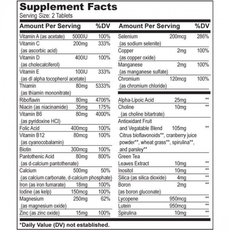 Ингредиенты: бета каротин, витамин А ацетат, аскорбиновая кислота, кальция аскорбат, холекальциферол, ди-альфа токоферол ацетат, фитонадион, тиамина мононитрат, пиридоксин HCl, цианокобаламин, кальций ди-пантотенат, кальция карбонат, кальция цитрат малат, железа фумарат, калия иодид, магния оксид, цинка оксид, гидролизованный протеиновый хелат, меди глюконат, марганца сульфат, натрия молибдат, curcubita pepo, холин битартрат, camelia sinensis, vaccinium macrocarpon, эфиры лютеина, haematococcus pluvialis, натрия метаванадат, целлюлоза, диоксид титана, растительные ацетоглицериды, хлорофилл, криптоксантин.