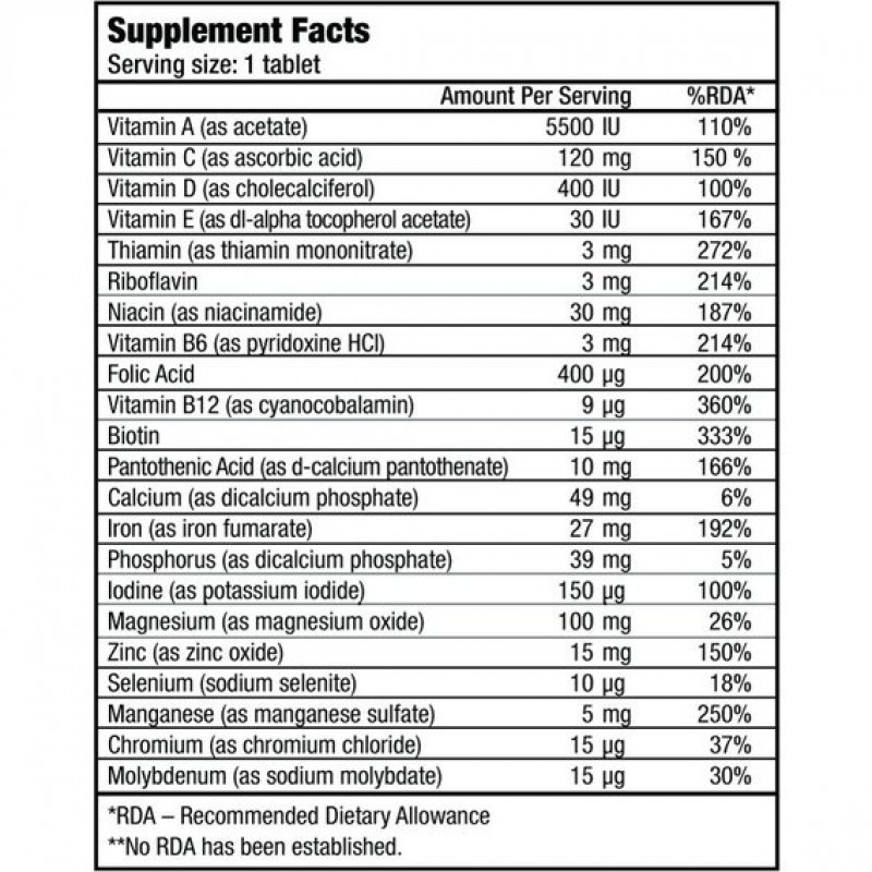 Комплексная витаминно-минеральная добавка One a Day - отличное решение для каждого человека, который стремится вести здоровый образ жизни. Прием комплекса One a Day обеспечит поступление всех самых необходимых веществ для нормального функционирования всего организма, а также во избежание проблемы тренировочного плато у спортсменов. При производстве такой качественной добавки как One-A-Day от Biotechиспользуются особые технологии, которые обеспечивают постепенное высвобождение элементов для максимально полного усвоения.Содержание элементов в 1й порцииВитамин А (ретинола ацетат) - 1650 мкгВитамин С (аскорбиновая кислота) - 120 мгВитамин D (эргокальциферол) - 10 мкгВитамин Е (ди-альфа токоферол) - 20 мгТиамин (тиамина мононитрат) - 3 мгРибофлавин - 3 мгНиацин (ниацинамид) - 30 мгВитамин В6 (пиридоксин HCl) - 3 мгФолиевая кислота - 400 мкгВитамин В12 (цианокобаламин) - 9 мкгБиотин - 15 мкгПантотеновая кислота (ди-кальция пантотенат) - 10 мгКальций (дикальция фосфат) - 120 мгЖелезо (железа фумарат) - 17 мгФосфор (дикальция фосфат) - 105 мгЙод (калия йодид) - 150 мкгМагний (магния оксид) - 100 мгЦинк (цинка сульфат) - 15 мгСелен (натрия селенит) - 10 мкгМарганец (марганца сульфат) - 4 мгХром (хрома хлорид) - 15 мкгМолибден (натрия молибдат) - 15 мкг